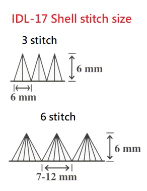 IDL-17A 专为车缝凉鞋或人字拖的贝壳线迹装饰边缘,藉由移动针数调整杆便可变换2种不同的花边。
