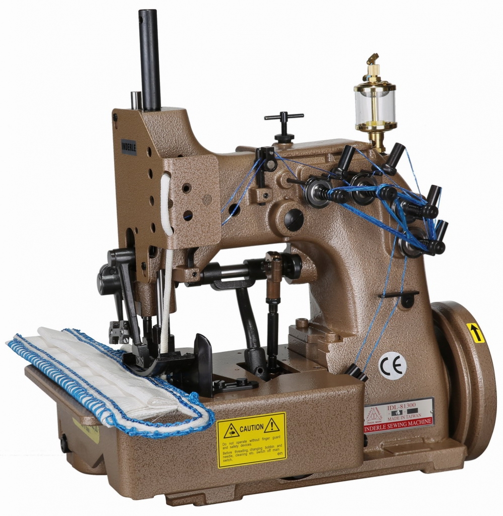 IDL-81300-A is safety stitch and overedge stitch machine with top and bottom feed for matched seams on heavy container bags. Equipped with guides for filler cord from the top or from the below for sealing the needle punctures of the left needle.